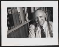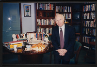 A person stands holding a small box while giving a speech. Bookshelves and a painting are in the background. This photograph was taken as part of filming C-SPAN's Lincoln-Douglas Debates series in Galesburg, Illinois.