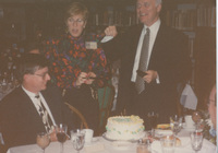 Brian Lamb speaks with two people while standing in front of a decorated cake. This photograph was taken as part of filming C-SPAN's Lincoln-Douglas Debates series in Galesburg, Illinois.