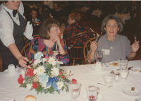 Two people chat while seated at a long dining table while others dine in the background and wait staff refill drinks. This photograph was taken as part of filming C-SPAN's Lincoln-Douglas Debates series in Galesburg, Illinois.