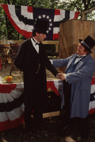 Two people, one dressed as Abraham Lincoln, the other dressed as Stephen Douglas, stand in front of the debate platform near a podium and red, white, and blue banners with stars. This photograph was taken as part of filming C-SPAN's Lincoln-Douglas Debates series in Freeport, Illinois.