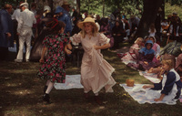 Two children in long dresses skip in a circle arm in arm, while other children in 19th-century period costumes sitting on blankets look on. A large crowd stands behind them. This photograph was taken as part of filming C-SPAN's Lincoln-Douglas Debates series in Freeport, Illinois.