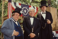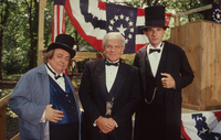 Brian Lamb poses with Tom and Lilly Myrick, who are dressed in 19th century period costume, prior to the Lincoln-Douglas debate reenactment. This photograph was taken as part of filming C-SPAN's Lincoln-Douglas Debates series in Jonesboro, Illinois.