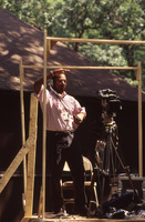 A person standing on a wooden platform wears a headset and looks through a video camera on a tripod. This photograph was taken as part of filming C-SPAN's Lincoln-Douglas Debates series in Freeport, Illinois.