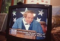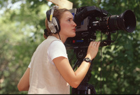 A cameraperson wearing a headset looks through a video camera. This photograph was taken as part of filming C-SPAN's Lincoln-Douglas Debates series in Freeport, Illinois.