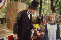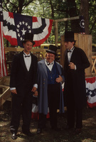 A person dressed as Abraham Lincoln poses with an elderly person and child, both dressed in 19th-century period costume. This photograph was taken as part of filming C-SPAN's Lincoln-Douglas Debates series in Freeport, Illinois.
