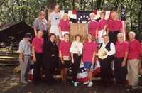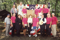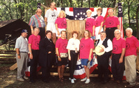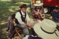 A group of people dressed in 19th-century period costume sit outdoors in wooden chairs set up in a circle. This photograph was taken as part of filming C-SPAN's Lincoln-Douglas Debates series in Freeport, Illinois.