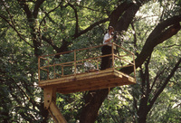 A cameraperson looks through a camera while standing on a wooden platform. Another cameraperson on a higher platform also films through a camera. This photograph was taken as part of filming C-SPAN's Lincoln-Douglas Debates series in Freeport, Illinois.
