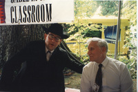 Brian Lamb and another person pose together on the sidewalk of a road. This photograph was taken as part of filming C-SPAN's Lincoln-Douglas Debates series in Freeport, Illinois.