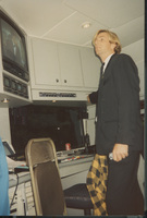 A young person in a suit stands in a small production area and watches a television. This photograph was taken as part of filming C-SPAN's Lincoln-Douglas Debates series in Freeport, Illinois.