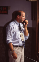 A Lincoln-Douglas Debates staff member speaks into a handheld radio. This photograph was taken as part of filming C-SPAN's Lincoln-Douglas Debates series in Freeport, Illinois.