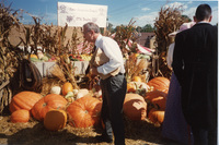 An older person in a shirt and tie holds a paper bag under their arm while looking at a group of pumpkins and squash with a sign that says "Anna-Jonesboro/Dongola FFA Display." This photograph was taken as part of filming C-SPAN's Lincoln-Douglas Debates series in Jonesboro, Illinois.