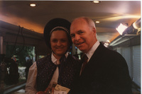 Brian Lamb poses with a person dressed in 19th-century period costume. This photograph was taken as part of filming C-SPAN's Lincoln-Douglas Debates series in Jonesboro, Illinois.