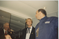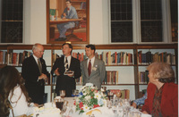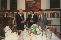 Brian Lamb and two other people stand at the head of a dining table; one of the people holds a small box. This photograph was taken as part of filming C-SPAN's Lincoln-Douglas Debates series in Galesburg, Illinois.