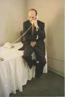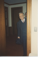 John Splaine peeks out from behind a doorframe. This photograph was taken as part of filming C-SPAN's Lincoln-Douglas Debates series in Galesburg, Illinois.