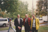 Three people stand together outside while another walks behind them. This photograph was taken as part of filming C-SPAN's Lincoln-Douglas Debates series in Galesburg, Illinois.