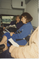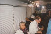 Susan Swain and another person wrapped in a coat stand near the C-SPAN Bus. This photograph was taken as part of filming C-SPAN's Lincoln-Douglas Debates series in Galesburg, Illinois.