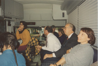 Two people sit on a couch inside the production area on the C-SPAN Bus. This photograph was taken as part of filming C-SPAN's Lincoln-Douglas Debates series in Galesburg, Illinois.