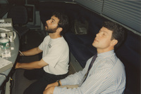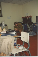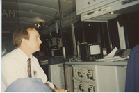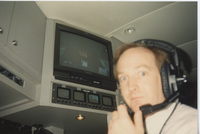 A member of the production staff, possibly identified as K. King, wears a headset and watches a television playing the Lincoln-Douglas debate re-enactment. This photograph was taken as part of filming C-SPAN's Lincoln-Douglas Debates series in Galesburg, Illinois.