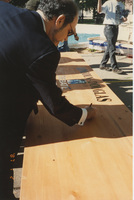A person signs a large, wooden plank with the words "Lincoln-Douglas Debate" printed on it. This photograph was taken as part of filming C-SPAN's Lincoln-Douglas Debates series in Galesburg, Illinois.