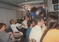 People sit in a production room, possibly in the C-SPAN School Bus, watching several screens. This photograph was taken as part of filming C-SPAN's Lincoln-Douglas Debates series in Galesburg, Illinois.
