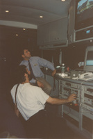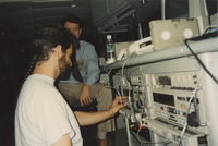 Production staff sit in a large room with several large pieces of production equipment. This photograph was taken as part of filming C-SPAN's Lincoln-Douglas Debates series in Galesburg, Illinois.