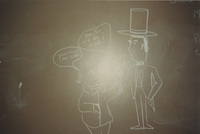 A chalkboard drawing of a cartoon showing Stephen Douglas saying "you mock me sir!" to Abraham Lincoln, who says "you, sir, are an igit!" This photograph was taken as part of filming C-SPAN's Lincoln-Douglas Debates series in Galesburg, Illinois.