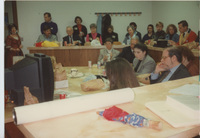 Close up of people seated at a table close together. This photograph was taken as part of filming C-SPAN's Lincoln-Douglas Debates series in Galesburg, Illinois.