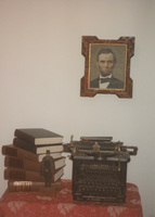 A table with books and a typewriter underneath a hung portrait of Abraham Lincoln. This photograph was taken as part of filming C-SPAN's Lincoln-Douglas Debates series in Galesburg, Illinois.
