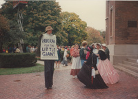 People in 19th-century period costume wait in line outside a large brick building while a young person on stilts holds a sign which says "Hurrah for the Little Giant." This photograph was taken as part of filming C-SPAN's Lincoln-Douglas Debates series in Galesburg, Illinois.