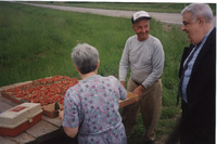 Three people stand outside around a table with small cartons of picked strawberries on a picnic table. This photograph was taken as part of filming C-SPAN's Lincoln-Douglas Debates series in Jonesboro, Illinois.