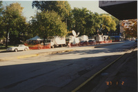 Scene of large trucks parked on the side of a road near a park. Some are cargo trucks, but one holds a large satellite. This photograph was taken as part of filming C-SPAN's Lincoln-Douglas Debates series in Galesburg, Illinois.