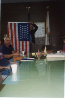 A person holds up a U.S. flag while others sit around a conference table in a wood-paneled room. This photograph was taken as part of filming C-SPAN's Lincoln-Douglas Debates series in Jonesboro, Illinois.
