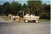 A group of people dressed in 19th-century period costume ride in a horse-drawn wagon. This photograph was taken as part of filming C-SPAN's Lincoln-Douglas Debates series in Jonesboro, Illinois.