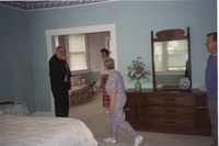 A group of people walk through the bedroom of an apartment with a floral couch and large wooden vanity. This photograph was taken as part of filming C-SPAN's Lincoln-Douglas Debates series in Jonesboro, Illinois.