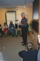 Nick Earl impersonating Carl Sandburg--Pulitzer Prize-winning poet, Lincoln biographer, and author--while people are gathered for breakfast at the Carl Sandburg State Historic Site. This photograph was taken as part of filming C-SPAN's Lincoln-Douglas Debates series in Galesburg, Illinois.