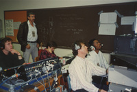 Production staff sit in a large room with several large pieces of production equipment. This photograph was taken as part of filming C-SPAN's Lincoln-Douglas Debates series in Galesburg, Illinois.