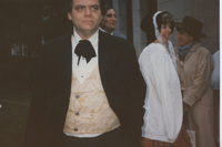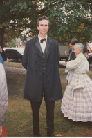 A person wearing 19th-century period costume stands in the foreground, while a group of people in 19th-century period costume converse behind him. This photograph was taken as part of filming C-SPAN's Lincoln-Douglas Debates series in Galesburg, Illinois.