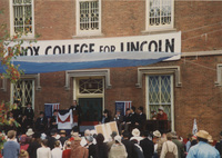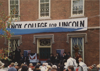 People mingle outside a brick building bearing a banner, which reads "Knox College for Lincoln." This photograph was taken as part of filming C-SPAN's Lincoln-Douglas Debates series in Galesburg, Illinois.