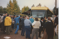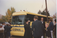 A large group of people, including some in 19th-century period costume, stand around the C-SPAN Bus. This photograph was taken as part of filming C-SPAN's Lincoln-Douglas Debates series in Galesburg, Illinois.