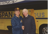 Brian Lamb poses for a photo with a young child outside the C-SPAN Bus. This photograph was taken as part of filming C-SPAN's Lincoln-Douglas Debates series in Galesburg, Illinois.