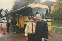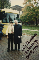Brian Lamb stands with a young child outside the C-SPAN Bus. The text on the photo is unclear but may read "Cris Gualberto, Galesburg, Oct 8, 1994." This photograph was taken as part of filming C-SPAN's Lincoln-Douglas Debates series in Galesburg, Illinois.