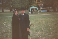 Two people in 19th-century period costumes pose together outdoors. This photograph was taken as part of filming C-SPAN's Lincoln-Douglas Debates series in Galesburg, Illinois.