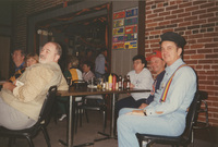 Several people sit at dining tables in a room decorated with streamers. This photograph was taken as part of filming C-SPAN's Lincoln-Douglas Debates series in Galesburg, Illinois.