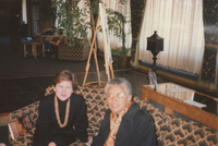 Glennette Tilley Turner (right) sits with another person on a couch in a reception area. This photograph was taken as part of filming C-SPAN's Lincoln-Douglas Debates series in Galesburg, Illinois.