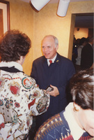 Brian Lamb stands in a crowded room, speaking with a person whose back is to the camera. This photograph was taken as part of filming C-SPAN's Lincoln-Douglas Debates series in Galesburg, Illinois.