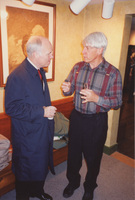 Brian Lamb and another person stand next to each other holding styrofoam cups. The room they are in is crowded. This photograph was taken as part of filming C-SPAN's Lincoln-Douglas Debates series in Galesburg, Illinois.