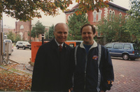 Brian Lamb stands near the C-SPAN Bus with another person wearing a Lincoln-Douglas Debate VIP badge. This photograph was taken as part of filming C-SPAN's Lincoln-Douglas Debates series in Galesburg, Illinois.