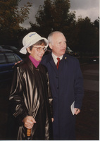 Brian Lamb poses with a person outdoors near a street. This photograph was taken as part of filming C-SPAN's Lincoln-Douglas Debates series in Galesburg, Illinois.