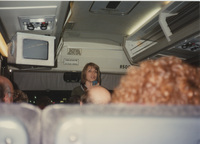 A group of people sit in seats on a charter bus. This photograph was taken as part of filming C-SPAN's Lincoln-Douglas Debates series in Galesburg, Illinois.
