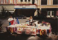 A young and older person set up a table of goods with a banner that reads "'Jesus,' King of the Nations" and two large pictures of Abraham Lincoln in front of the Washington Theater where the marquee says "Lincoln-Douglas Debate." Quincy.